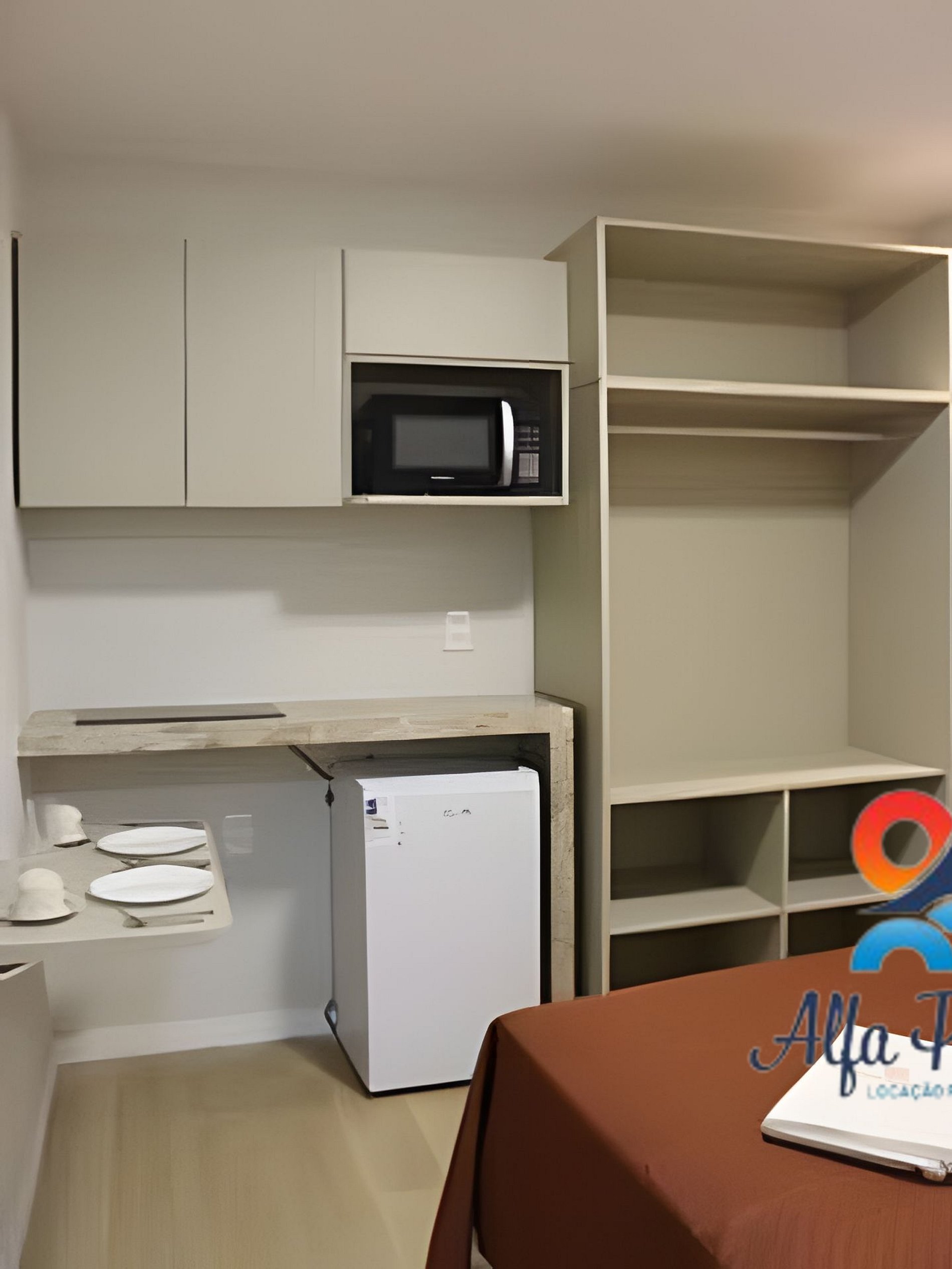 Cozinha equipada com fogão, frigobar e utensílios